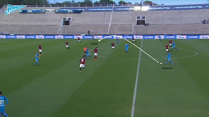 У своей штрафной Кришито и Нету устраивают перепасовку для того, чтобы выключить из игры нападающего соперника, после чего Доменико с мячом продвигается до центрального круга и выполняет передачу вперед. Иногда итальянец выполняет передачу низом вперед на Жулиано, но чаще от 4-го номера «Зенита» следует диагональ. В этом случае – на Артема Дзюбу, смещения на фланг которого неожиданно становятся серьезной проблемой для питерцев.