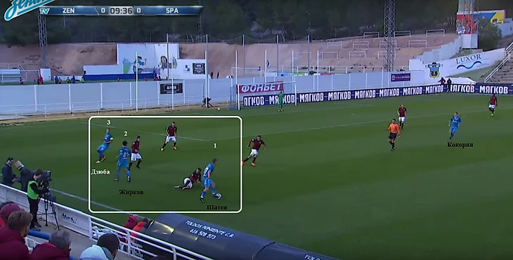 Дзюба уходит с позиции центрфорварда на левый край. На его место смещается Кокорин, из центра поля Александру никто не помогает. Кроме того, Анюков не очень активно поддерживает атаку, закрывая зону, освобожденную Кокориным, поэтому вправо смещается Жулиано, а в центре у «Зенита» образовывается явный недостаток игроков. Сам Дзюба в это время перекрывает направление движения для Жиркова, мешая Юрию продвинуться к лицевой линии.