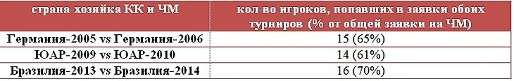 Более половины футболистов, попадавших в заявки Германии-2006, ЮАР-2010 и Бразилии-2014, за год до чемпионата мира участвовали в Кубке конфедераций. У немцев цифра была бы еще больше, если бы Мирослав Клозе не получил травму перед самым стартом КК-2005 (его заменил Томас Брдарич).