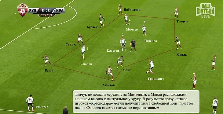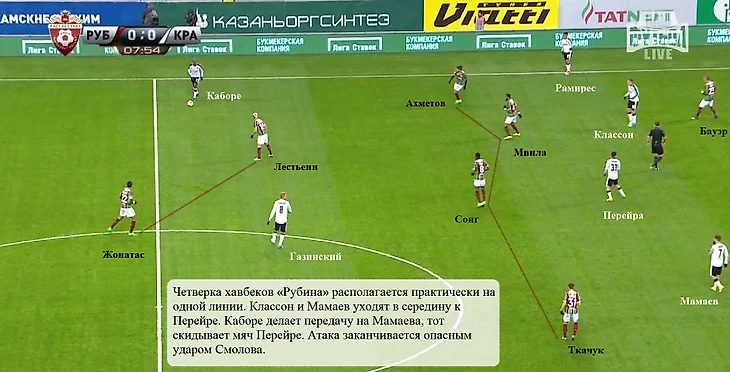 Впервые с 5 ноября в опорной зоне казанцев одновременно появились Янн Мвила и Алекс Сонг. На француза и камерунца легла большая нагрузка – «Краснодар» привычно создавал перегрузы в середине поля, куда с флангов смещались Классон и Мамаев. Мвила и Сонг позволяли атакующим хавбекам команды Шалимова принимать передачи между средней линией и защитниками «Рубина». Чаще всего это происходило, когда один из центральных полузащитников казанцев выдергивался вперед для оказания давления на Каборе, но случались и совсем элементарные ситуации.