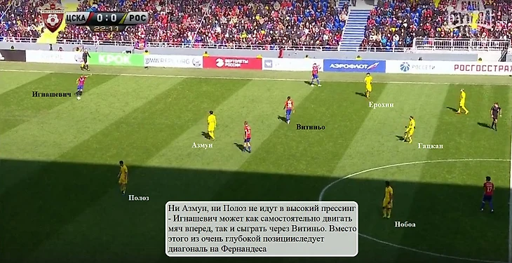 В начале матча с «Ростовом» Игнашевич был самым центральным из трех защитников армейцев, а Васин располагался ближе к левому флангу. Уже на 16-й минуте Сергей и Виктор поменялись местами. Очевидно, что это было сделано для повышения эффективности диагоналей на Марио Фернандеса – когда они следовали из левого полуфланга, центральные полузащитники «Ростова» (в первую очередь Нобоа) были больше ориентированы на середину поля, а Терентьев оставался с Фернандесом один в один.