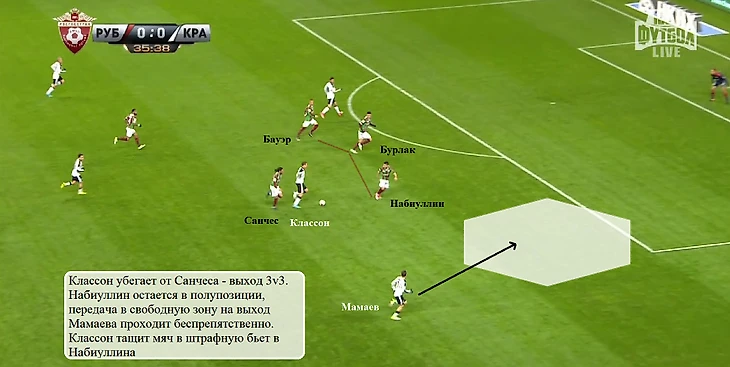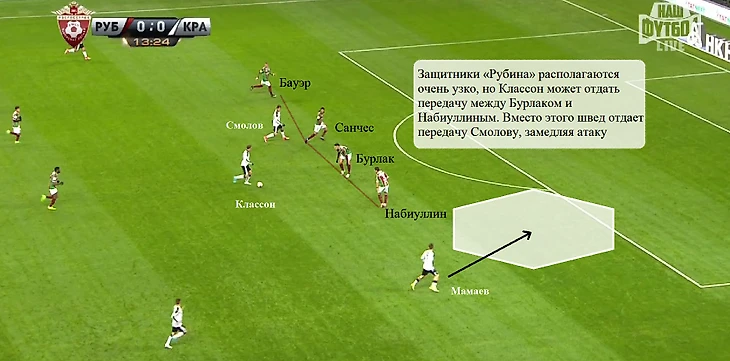 Против «Рубина» Петров чаще получал мяч у чужой штрафной (5 касаний, 2 – в ней), но теперь Классон не отдавал передачу на свободного Мамаева. Возможно, если бы пас на Павла все-таки следовал, «Краснодар» забил первый мяч еще в первом тайме.