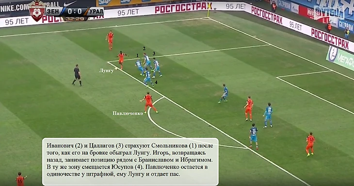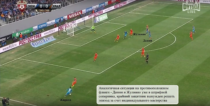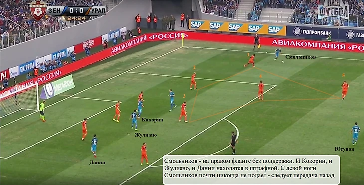 Атакующие полузащитники часто неоправданно уходят в центр (у Данни это происходит только на чужой половине, в центре поля он, наоборот, мешает крайнему защитнику, сжимаясь к бровке) и не открываются под передачу от Смольникова или Жиркова. Матч с «Уралом» стал ярким подтверждением структурных проблем «Зенита» – петербуржцы не могли правильно расставиться у штрафной Заболотного, а атака еще больше замедлялась.