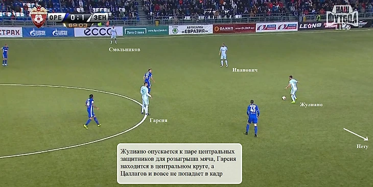 Формация «Оренбурга» вообще оказалась довольно удобной для петербуржцев – она не обнажала большие разрывы между средней зенитовской линией и обороной. Благо и Попович предпочитали атаковать из глубины, находясь с мячом, а Парняков и Григорьев нечасто смещались в центр. В игре с «Уралом» свободные зоны перед парой центральных защитников «Зенита» образовывались постоянно, в основном их своевременно заполнял Павлюченко.