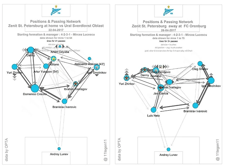 Карта передач «Зенита» в матчах против «Урала» (слева) и «Оренбурга».