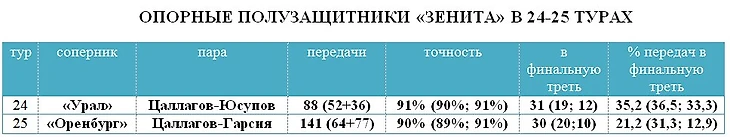 В игре с «Уралом» выход из обороны привычно осуществлялся через Кришито. Больше итальянца передач в финальную треть отдали лишь Жулиано и Данни, а по количеству перехватов Доменико серьезно опередил всех партнеров (6 из 9 общекомандных). В «Оренбурге» в начальной фазе атаки чаще других зенитовцы использовали комбинацию Иванович – Смольников, а опорники (в частности, усредненная позиция Цаллагова в 25-м туре серьезно отличается от того, что было против «Урала») далеко не всегда опускались к защитникам для розыгрыша мяча. Во многом по этой причине Жулиано провел самый энергозатратный матч этой весной. Бразилец, в последних матчах не часто получавший матч, против «Оренбурга» стал третьим по количеству касаний (81) и передач (69), при этом 42 из них пришлись на среднюю треть поля.