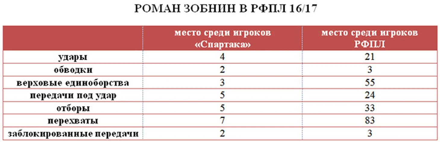 По сравнению с предыдущим сезоном Зобнин прибавил во всех компонентах, кроме перехватов (с 1,9 до 1,3 в среднем за матч). Это объясняется спецификой функций. Если в «Динамо» в сезоне 15/16 роли между центральными хавбеками были распределены лишь номинально (на поле царил хаос), то в «Спартаке» Зобнин наряду с Глушаковым отвечает за активное давление на соперника с мячом, за отборы, а перехваты – зона ответственности Фернандо. Роман стал чаще выигрывать верховые единоборства (51% выигранных против 43% в прошлом сезоне) и обыгрывать оппонентов (63% удачных обводок против 56% за «Динамо»). Снизилось количество потерь (с 1,8 до 1,6).