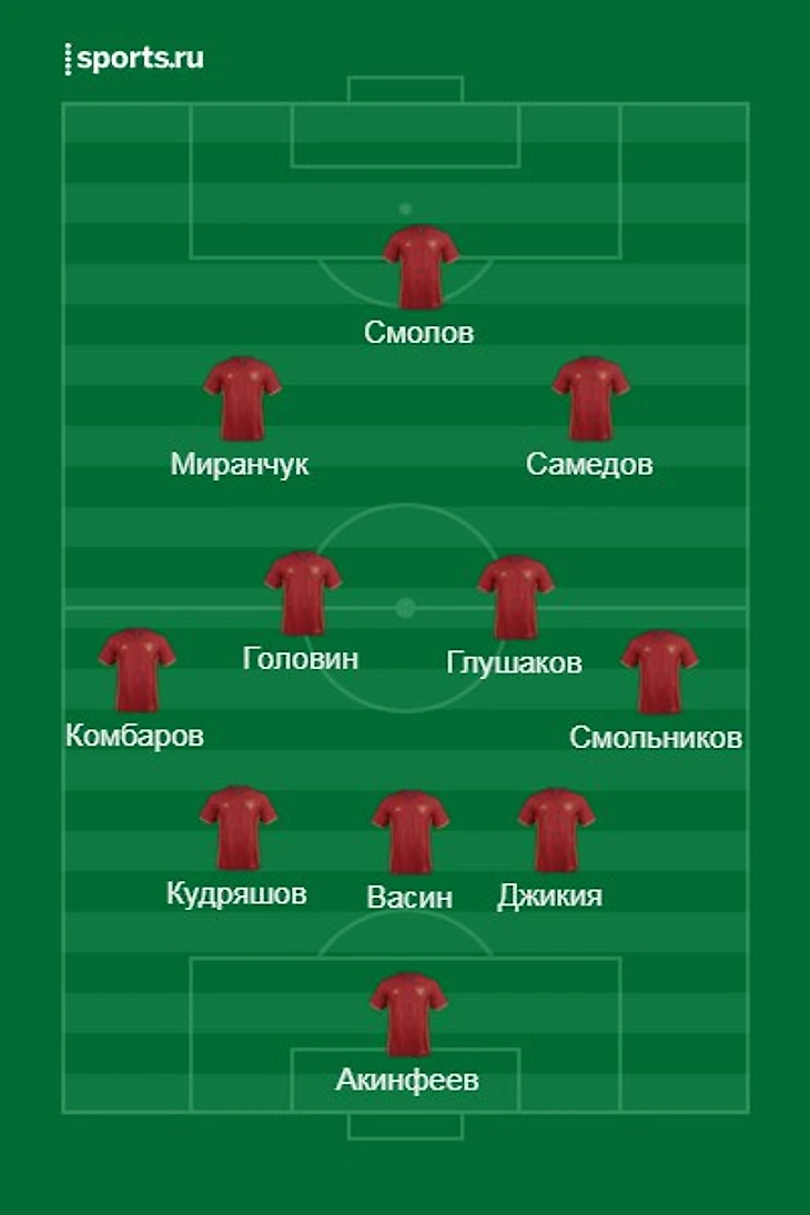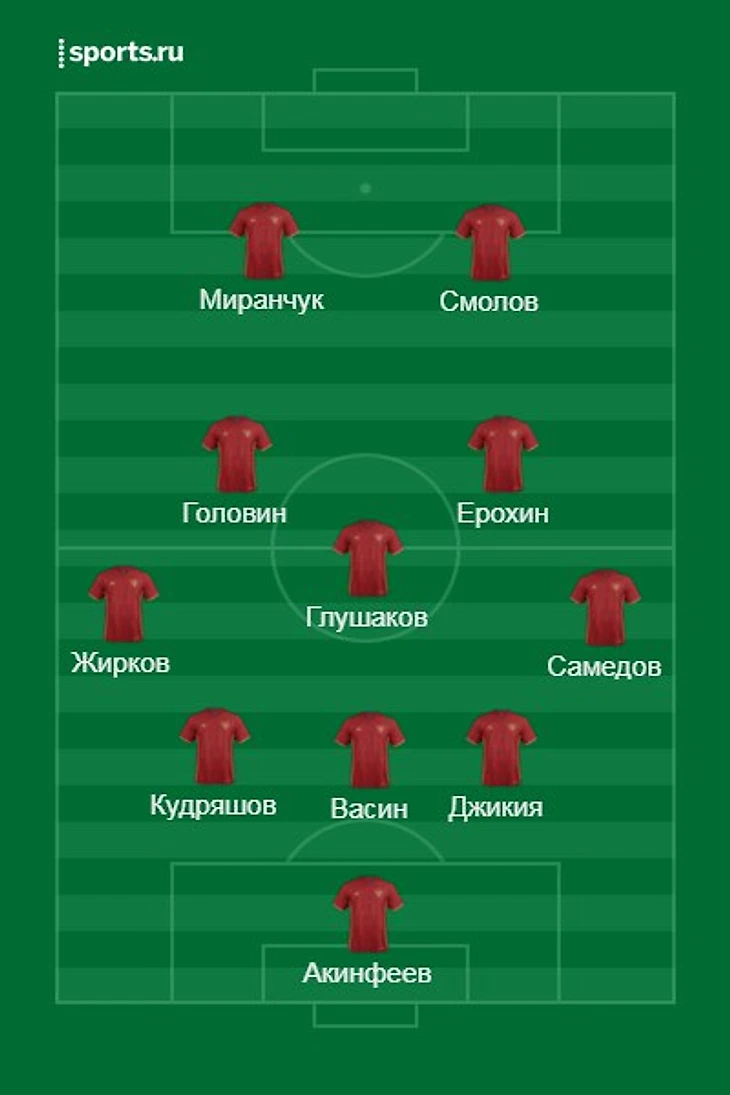 Вариант матча против Чили (за исключением замены Джикии на Шишкина). Самедов неожиданно оказался в середине поля, при атаках образуя узкий четырехугольник с Глушаковым, Головиным и Миранчуком.