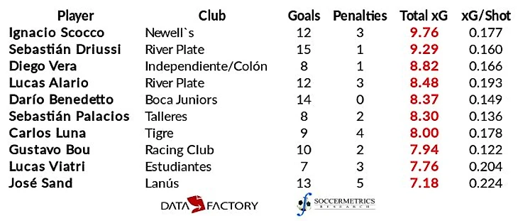 Это данные, выложенные Soccermetrics, по состоянию на 17 мая. С тех пор Дриусси отличился еще дважды (один раз – с пенальти), но общая суть не изменилась: нападающий забивает почти в два раза больше ожидаемого. Похожая ситуация и у Дарио Бенедетто из «Боки» – лучшего бомбардира чемпионата с 19 голами на сегодня.