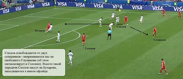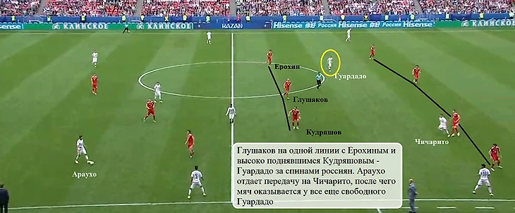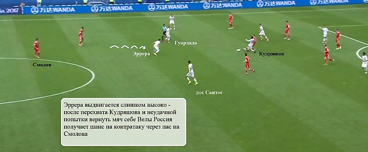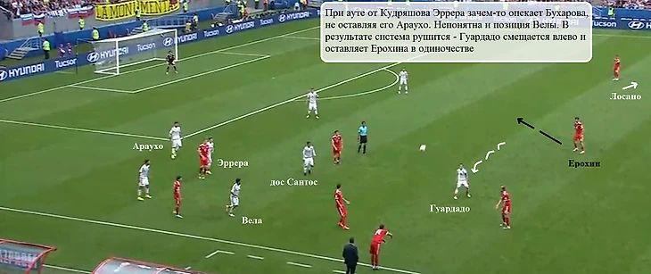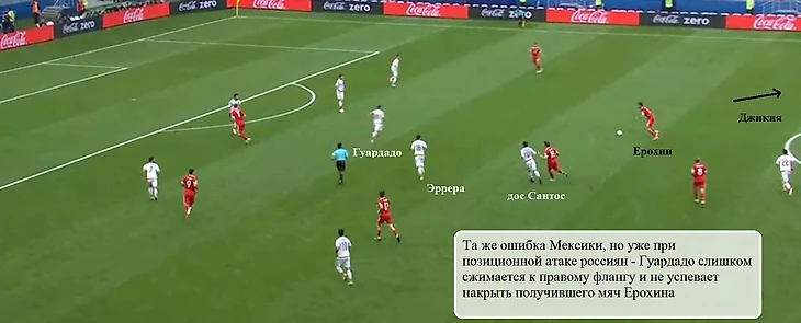 Между российским опорником (с Мексикой номинально глубже других располагался Глушаков) и центральными защитниками вновь возникали большие зоны, в которые врывались Гуардадо и дос Сантос.