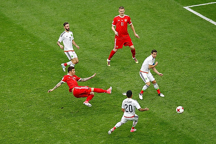 Другим уязвимым местом у соперника была середина поля, где Эррера, Гуардадо и дос Сантос не могли поделить функции между собой. Чаще других ближе к воротам Акинфеева оказывался дос Сантос, но это не было системой – трио мексиканских хавбеков то вместе сваливалось на один из краев, то убегало к штрафной россиян, оставляя за своими спинами пустые зоны.