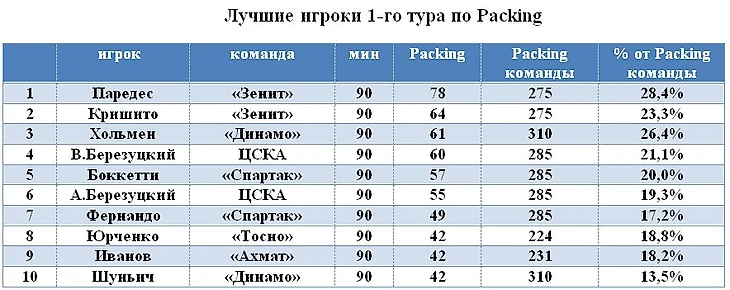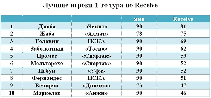 Неожиданно присутствие трех игроков: Юрченко и двух динамовских защитников. Вратарь «Тосно» попал в топ-10 благодаря стилистическим особенностям команды Парфенова, а Хольмен и Шуньич из-за неслаженных попыток прессинга спартаковцами во втором тайме. Братья Березуцкие хорошо задействовали Фернандеса и Щенникова во время долгих позиционных армейских атак.
