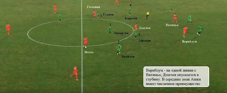 При переходе армейцев на чужую половину поля Понтус оказывался на одной линии с Витиньо, а в середину уходил Дзагоев, номинально игравший второго форварда. Конечно, Алан лучше продвигает мяч, чем Вернблум, но общее количество игроков ЦСКА, участвующих в билд-апе не изменилось. Слова Александра Григоряна о том, что «Анжи» был не готов к выходу Дзагоева и трудностям, появившимся в связи с ним, звучат странно.