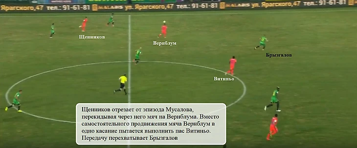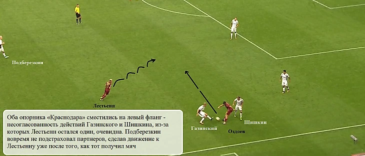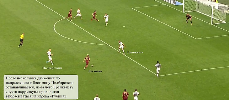 На 61-й минуте Шалимов убрал с поля одного из лучших игроков «Краснодара» Перейру, выпустив на замену Классона. Виктор занял позицию Подберезкина на правом фланге, а Подберезкин ушел в центр. После этой замены Кудряшов пропал – Классон успевал не только поддерживать атаку, но и персонально играть против Федора, когда с мячом находился «Рубин». Но проблемы Краснодара на этом не закончились – Подберезкин допускал позиционные ошибки и после перевода в середину. В голе Лестьенна виноват не только 11-й номер краснодарцев, но в результативном эпизоде Подберезкин показал себя крайне недисциплинированным игроком.