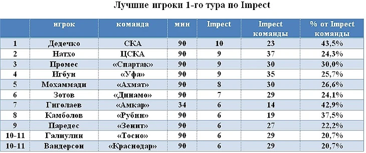 Дедечко набил большую часть Impect двумя передачами – обе последовали из центра поля на правый край за спину Кокорину (в первом тайме) и Шатову (во втором). Галиулин, отрезавший передачами в сумме шестерых защитников «Уфы», отдал 4 ключевых передачи (столько же – только у Калачева и Перейры).