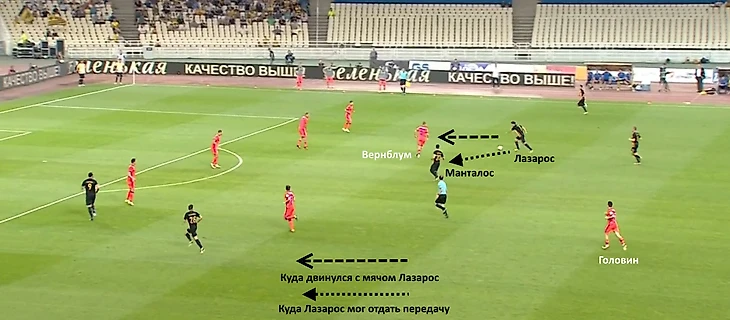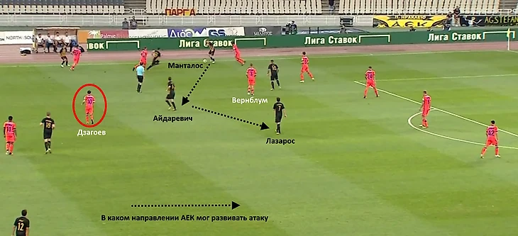Из-за выхода Чалова в глубину поля вернулся не только Вернблум, но и Дзагоев, который в Греции опускался гораздо ниже, чем в первых двух матчах РФПЛ. К сожалению, Алан еще далек от оптимальных кондиций, и это проявляется даже в работе без мяча – против АЕК Дзагоев был недостаточно дисциплинирован при позиционной обороне.