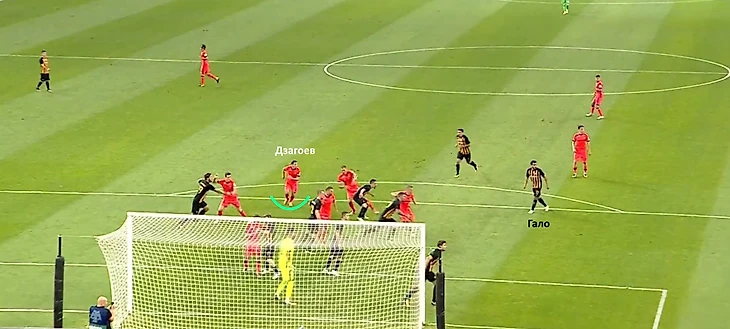Гало так и остался на линии штрафной, вероятно ожидая возможности убежать в контратаку. Однако учитывая положение партнеров Родриго, скорее всего, именно он должен был держать Дзагоева.