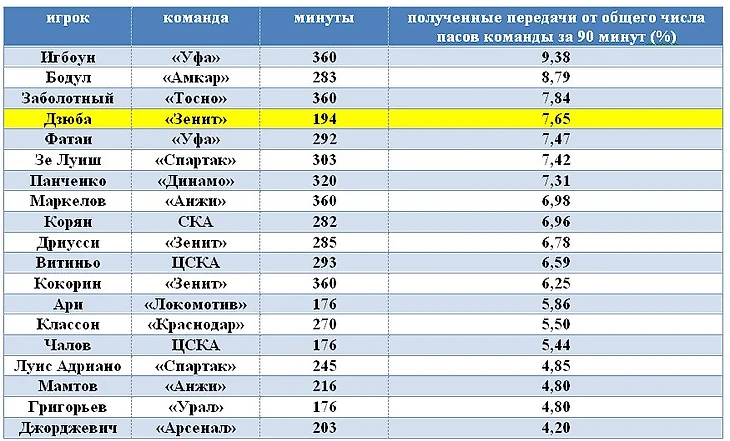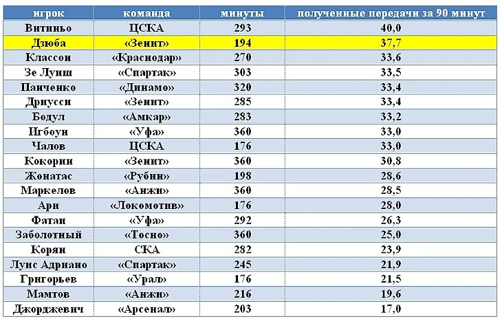 Дзюба сыграл менее 200 минут, что, конечно, прямо коррелирует с его показателями. Тем не менее, нападающий показывает довольно высокий уровень вовлеченности в атакующие действия «Зенита», и количество полученных передач в среднем за 90 минут на дистанции не должно упасть ниже 30.