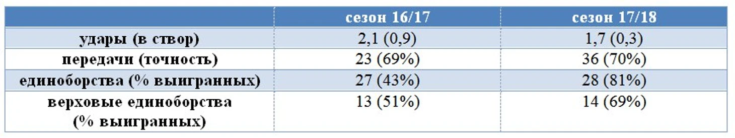 Проблемы с коленом хоть и сказались на подготовке Дзюбы к сезону, но ухудшения в статистике есть только по одному показателю: удары по воротам. В единоборствах Артем и вовсе значительно прибавил – правда, нельзя забывать о малой выборке по этому сезону.