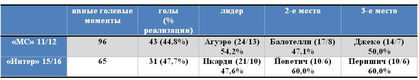 Лучший сезон в тренерской карьере Манчини – 11/12, когда итальянцу удалось построить в «Сити» одну из самых ярких команд в истории АПЛ. Тройке Агуэро – Балотелли – Джеко, имевшей огромное количество моментов, активно помогали Давид Сильва, Адам Джонсон и даже Майка Ричардс с Джолеоном Лескоттом. В последний сезон во главе «Интера» (15/16) у Манчини тоже была очень серьезная линия атаки.
