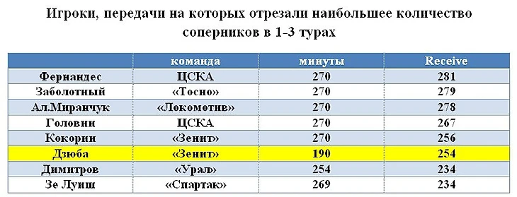 В результате, несмотря на то, что Дзюба в игре с «Тосно» появился на поле только во втором тайме, по итогам трех туров Артем вошел в числу лучших игроков сезона по Receive – показателю, оценивающему игроков, передачи на которых отрезали от эпизода наибольшее количество футболистов соперника.