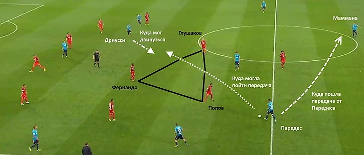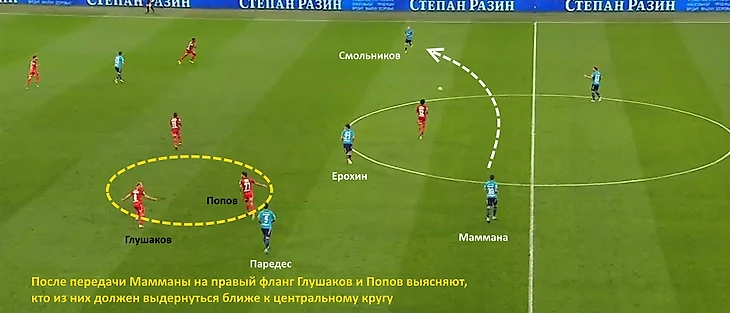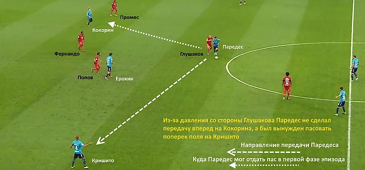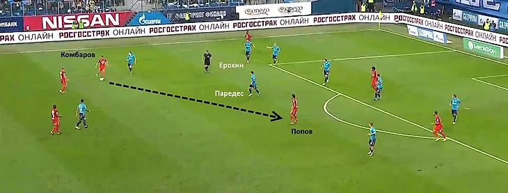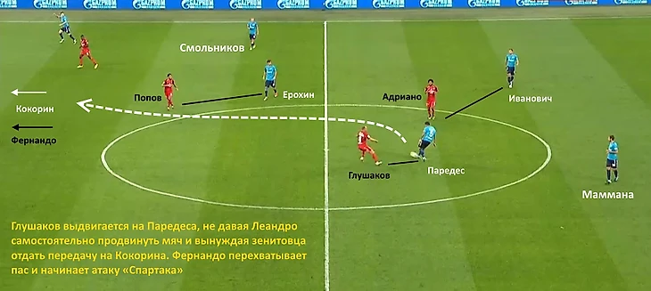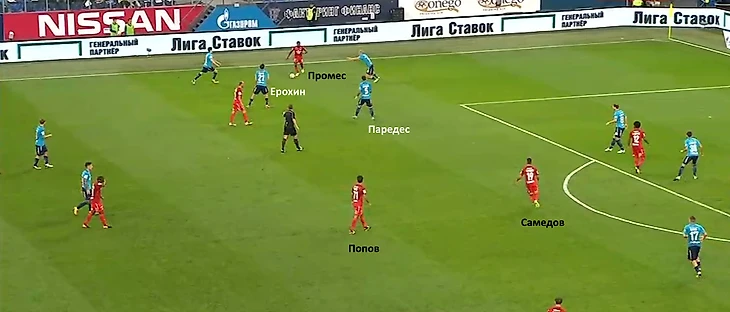 Причина относительной пассивности Паредеса – выход в старте у «Спартака» Попова и увеличение количества игроков центральной оси. Болгарин персонально по зенитовскому полузащитнику не играл, но наличие Ивелина позволило москвичам избегать постоянных разрывов между линиями (что было до перевода Самедова в центр в игре с «Краснодаром») и выдвигаться вперед Глушакову.