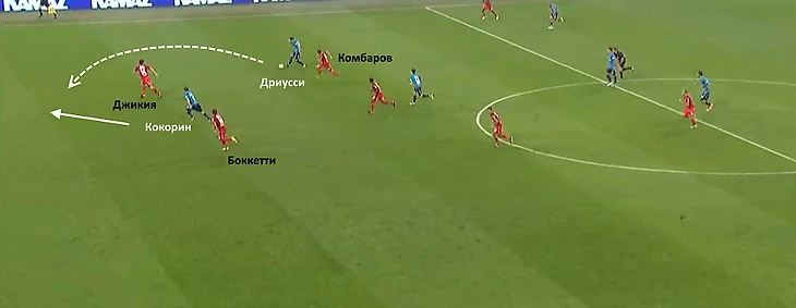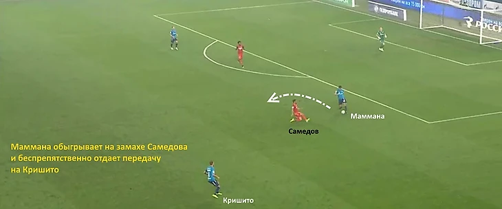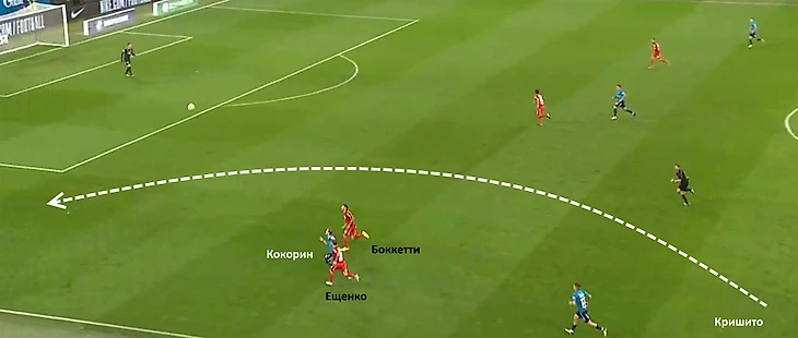 Перед подачей Паредеса Кришито четыре раза изменил направление движения – в итоге Комбаров проиграл позицию итальянцу еще до касания мяча Кокориным.