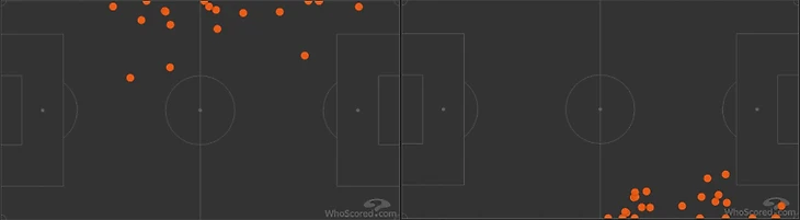 Лишившись возможности атаковать через центр, питерцы сосредоточили внимание на флангах и полуфлангах, куда часто сваливались Кокорин и Дриусси. Характер атак через правый и левый край у «Зенита» серьезно отличались – об этом ярко говорит карта передач, выполненных Кришито и Смольниковым, в финальную треть поля.