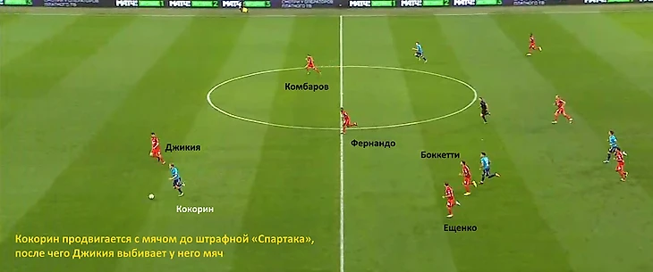 После потери мяча спартаковские защитники не успели перестроиться, а Боккетти проспал рывок Кокорина.