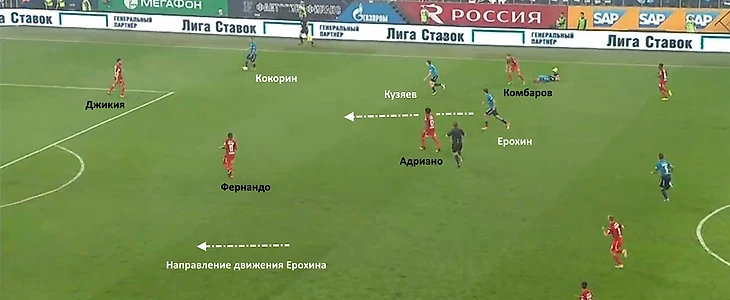 Перед голом Ерохина грубейшие ошибки допустил Луис Адриано. Бразильский форвард сначала отдал неточную передачу на Промеса в центральном круге, но главное произошло через несколько секунд. После перехвата Смольникова ближайшим игроком «Спартака» к Ерохину оказался именно Адриано.