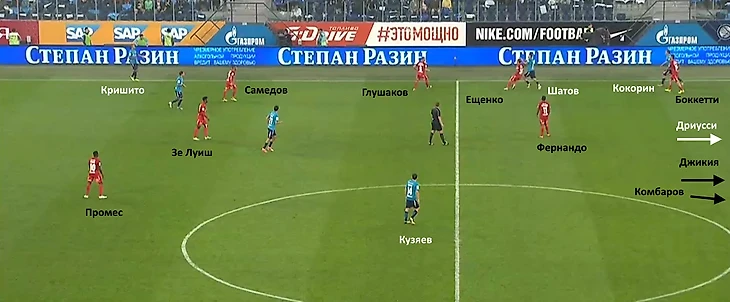 Неожиданнсотей хватало и без новичков. У «Спартака» впервые в сезоне в запасе остался Зе Луиш – Каррера решил насытить середину поля за счет Попова. «Зенит» немного удивил не кадровыми перестановками, а выбором схемы и расположением игроков. Увидев за час до матча протокол, многие подумали, что Манчини сделал ставку на 4-3-3 с трио Паредес – Кузяев – Ерохин в центре, но уже при первой атаке «Спартака» стало понятно, что Далер в этой игре привязан к правому краю.