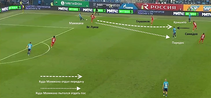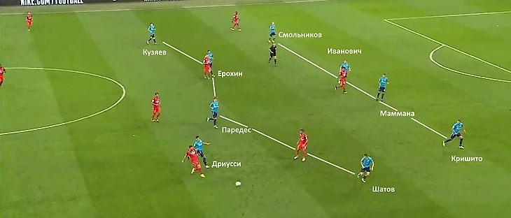 Все передачи в финальную треть от правого защитника питерцев были сделаны с чужой половины поля. Кришито слева действовал иначе – итальянец чаще использовал забросы на Дриусси и Кокорина за спину Ещенко, после которых нападающие команды Манчини оставались один в один против Боккетти.