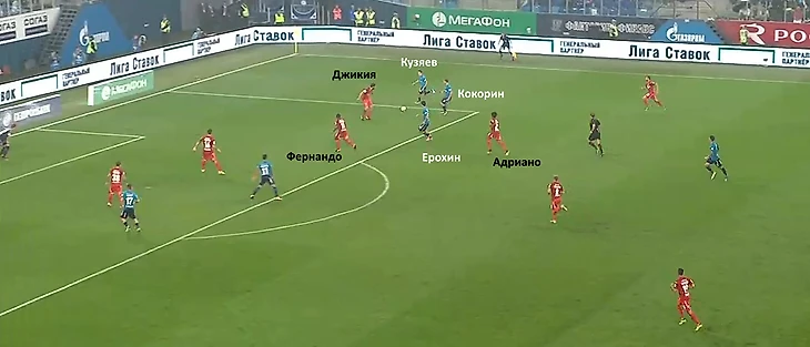 Через две секунды Адриано был уже далеко позади Ерохина. Фернандо побежал страховать Джикию, пытаясь накрывать Кузяева – 21-й номер «Зенита» остался в одиночестве у линии вратарской.