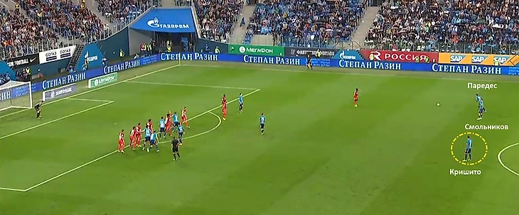 Доменико забил уже второй гол после угловых в этом сезоне. При Манчини «Зенит» очевидно уделяет большое внимание стандартам, и перманентное появление Кришито на дальней штанге ворот соперников при угловых уже не удивляет. Интересно, что при навесах со штрафных Кришито остается в центре поля для подстраховки партнеров.