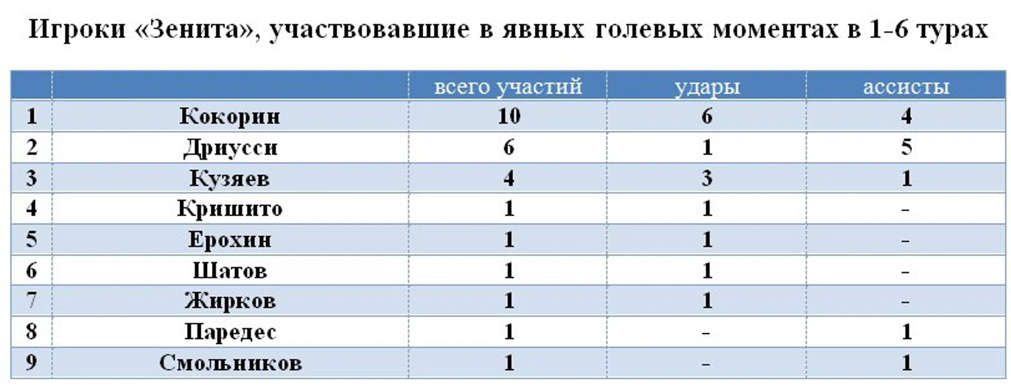 За шесть туров «Зенит» создал 14 явных голевых моментов, но доля Шатова в них крайне незначительна.