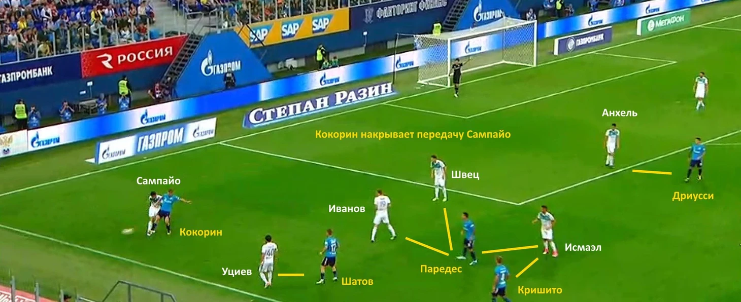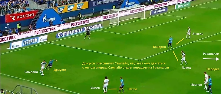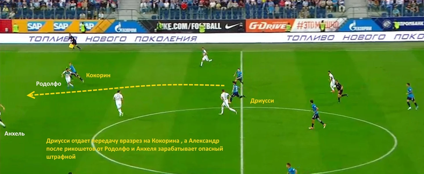 Эпизод перед голевым штрафным Паредеса очень напомнил первый гол в ворота «Спартака»: прием мяча Дриусси в центре поля и быстрая передача на Кокорина между защитников соперника.