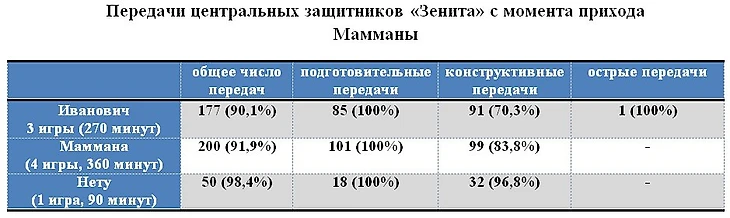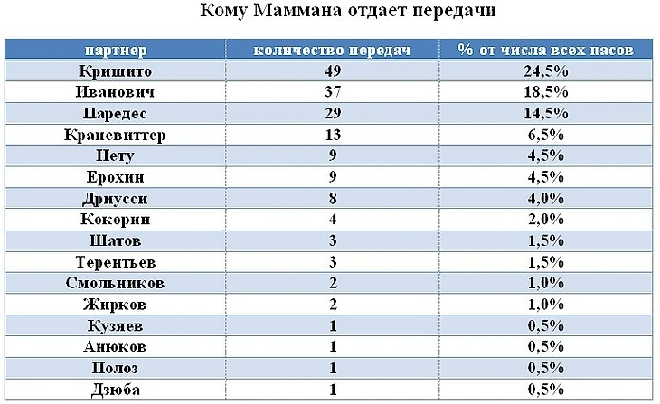Несмотря на то, что Маммана сыграл на 90 минут больше, чем Иванович, по числу конструктивных передач аргентинец опередил Бранислава всего на 8 пасов. В «Зените» Эмануэль предпочитает не рисковать при выполнении передач – это четко видно исходя из адресатов пасов Мамманы.