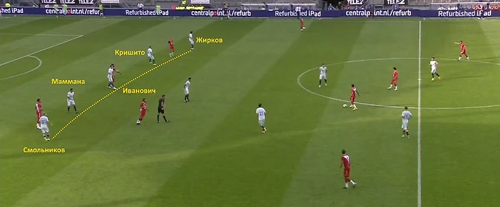 Пожалуй, лишь передача на Кокорина в середине первого тайма (Александр завершил атаку ударом с левой ноги) от Мамманы действительно помогла «Зениту» перевести мяч в финальную треть.