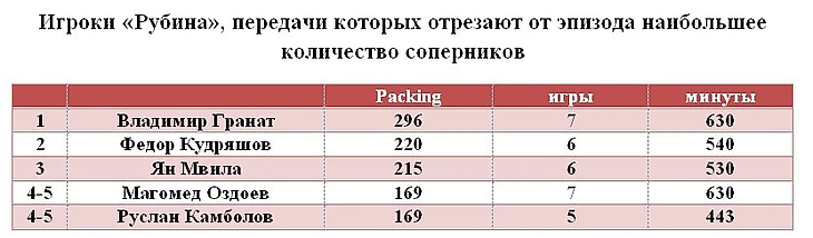 В топ-5 сразу три центральных защитника – Гранат, Федор Кудряшов и Руслан Камболов. «Рубин» редко держит мяч внизу – по средней длине передач (20,1 м) казанцы занимают 2-е место в лиге после «Тосно», а чаще команды Бердыева длинные пасы (в среднем за матч 42) не использует никто (столько же – «Ростов» и «Арсенал»). У Оздоева физически не так много возможностей для получения мяча, от того и довольно скромные цифры по Packing.