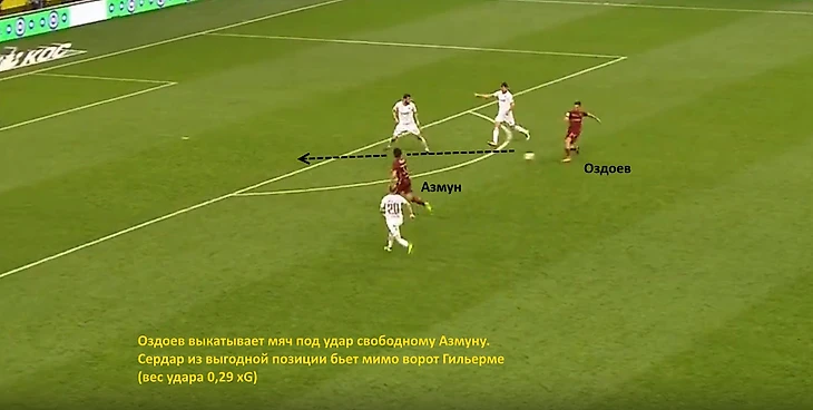 Неплохое качество пасов Оздоева под удар подтверждает и xG-метрика. По xA (0,14) Магомед занимает 15-е место в лиге среди игроков, проведших на поле не меньше 500 минут. Конечно, это лучший показатель в «Рубине», не сильно полузащитник отстал и от Леандро Паредеса с Евгением Черновым (оба – по 0,15 xA), Раде Дугалича с Далером Кузяевым (оба – по 0,16 xA) и Александра Головина (0,18 xA).
