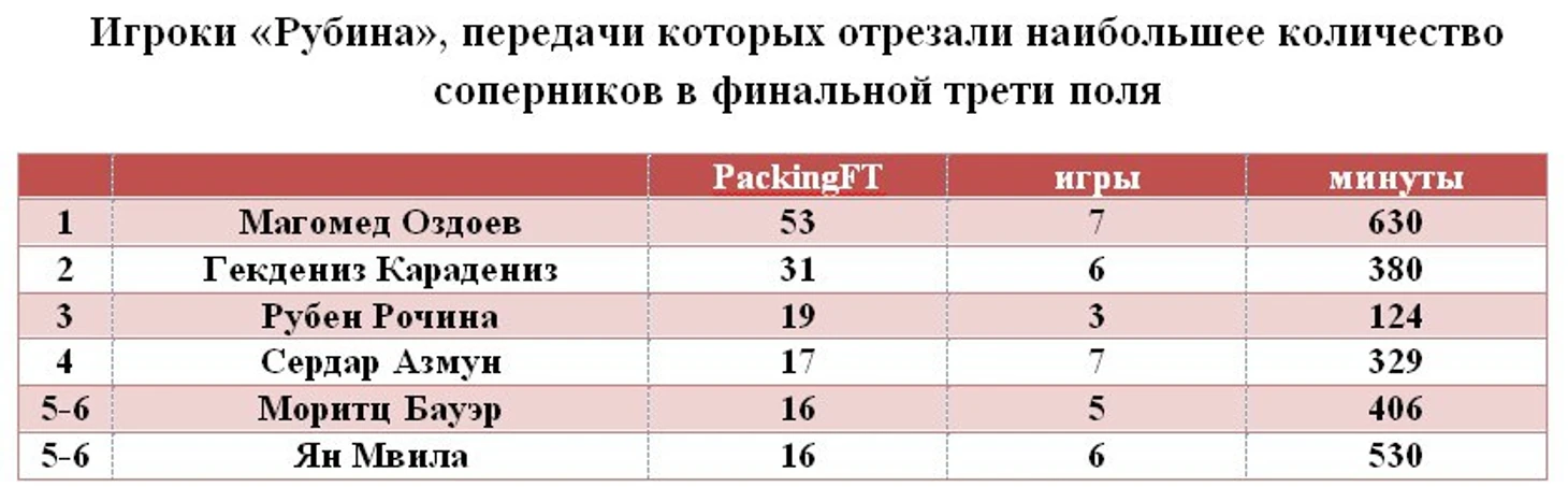 Совсем по-другому выглядят показатели по разновидности Packing – Packing Final Third (передачи, отрезающие соперников в финальной трети поля). Здесь Оздоев для «Рубина» очень важный игрок.