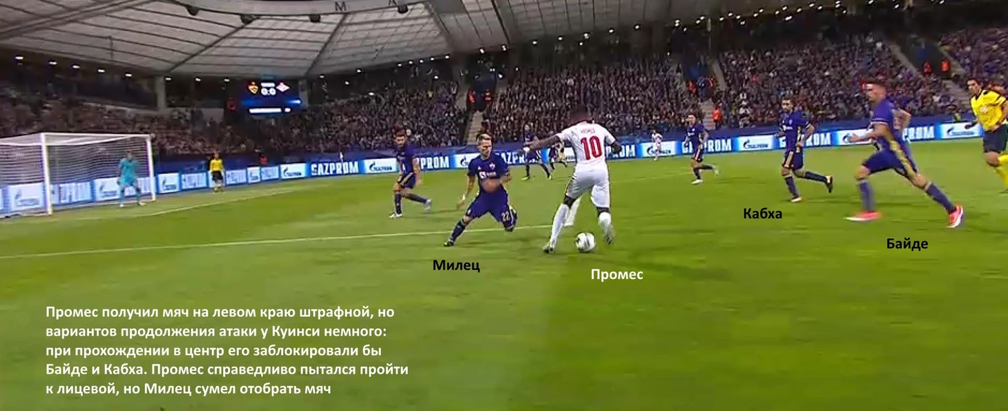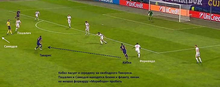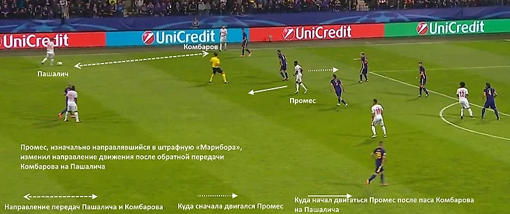 «Марибор» в отличие от хабаровского СКА и «Рубина» играет с 4-2-3-1. Ожидалось, что словенцы будут обороняться не так низко, как предыдущие соперники, но с середины первого тайма «Марибор» начал довольно сильно прижиматься к своей штрафной. Промес в эти моменты находился на одной линии с Луисом Адриано, не предлагая себя Пашаличу, Фернандо и Комбарову в качестве потенциального адресата передачи. Исключение случалось только в одном случае: когда Комбаров получал мяч и останавливался на пару секунд, либо сразу отдавал обратный пас назад. Тогда Промес отскакивал ближе к середине поля и получал мяч. Например, это произошло на 29-й минуте.