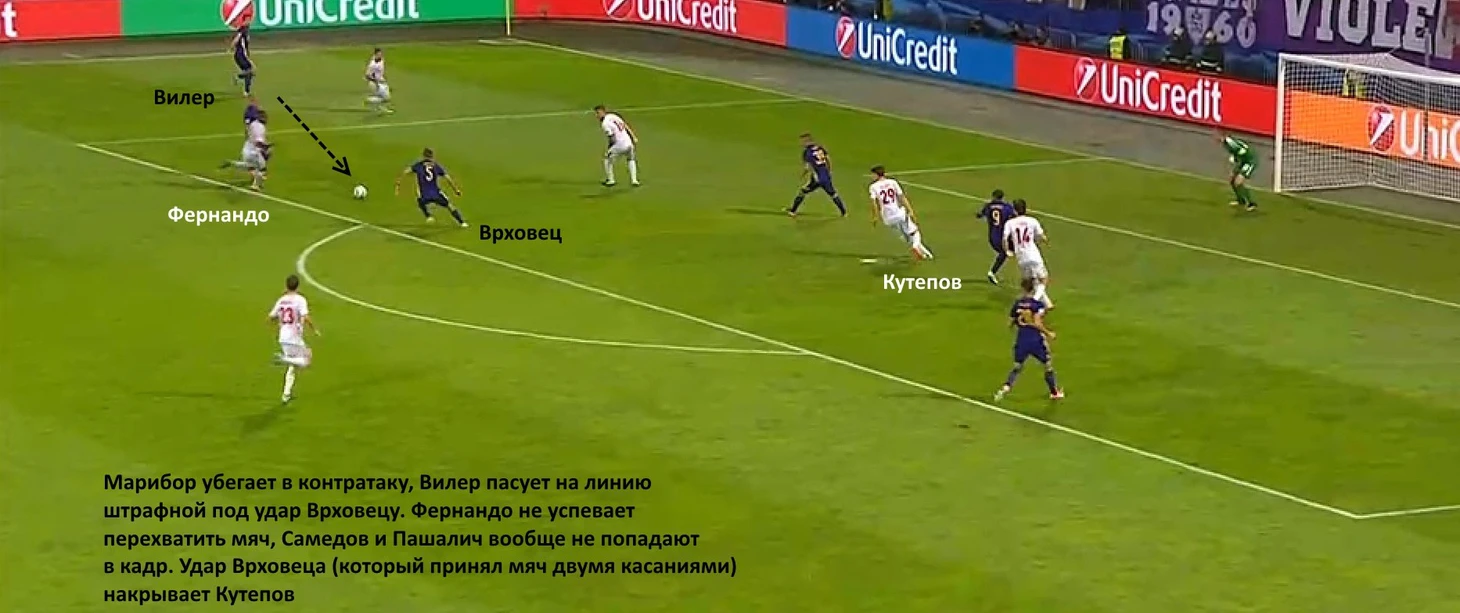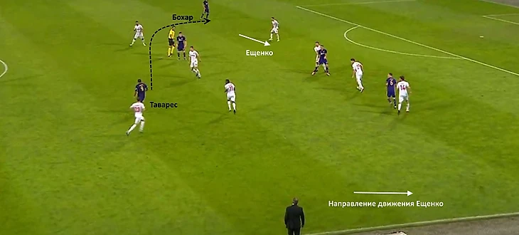 Почти все атаки команды Карреры в самом начале матча шли через край Ещенко. Проникать через него в штрафную «Марибора» у москвичей получалось без особых проблем: левый защитник словенцев Вилер постоянно терял позицию, хавбек Бохар в обороне участия не принимал, а левый центральный защитник Шулер страховать партнеров не успевал.