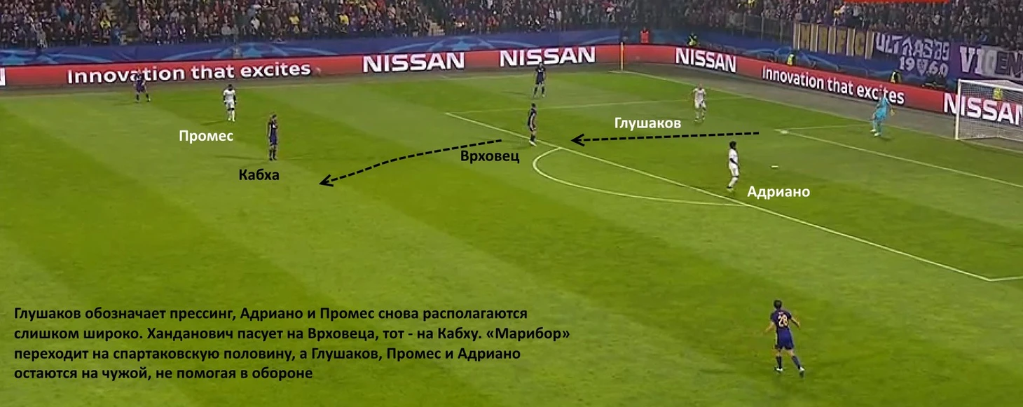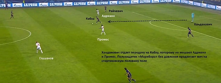 После удара Адриано на 6-й минуте инициативой завладел «Марибор». Во многом это произошло из-за отсутствия давления на Райчевича, Шулера, Кабхы и Врховеца в первой фазе атаки. Промес и Адриано, во-первых, слишком широко располагались, позволяя словенцам продвигать мяч через центр, а, во-вторых, в принципе были пассивны.