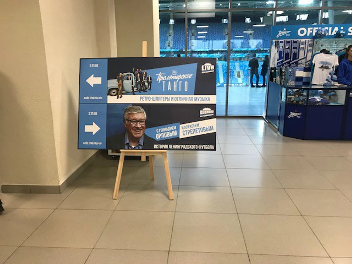 На втором этаже стадиона «Санкт-Петербург» выступила популярная петербургская группа «Пролетарское танго», исполнявшая каверы на известные песни прошлого.