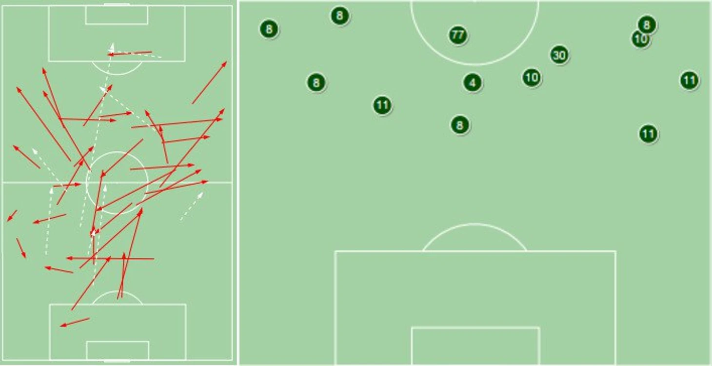 Карта передач Газинского в первом тайме (белые линии – неточные пасы) и карта потерь «Краснодара» на своей половине поля до перерыва (Газинский – №8).