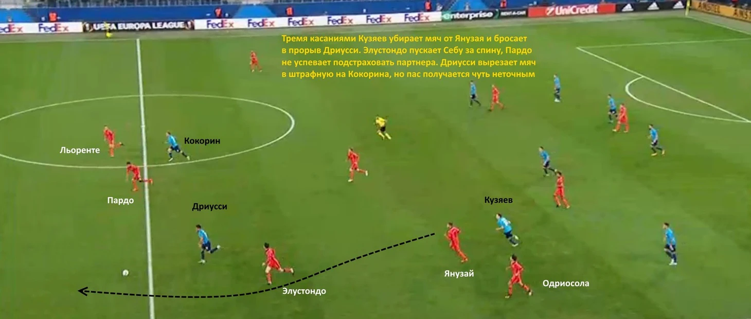 Пардо вместе с Льоренте и Элустондо разбрасывал мяч по флангам на Одриосолу и де ла Белью, но продолжение атаки следовало редко. Чаще всего после приема крайних защитников «Реал Сосьедада» накрывали питерцы, и Одриосола с де ла Бельей были вынуждены возвращать мяч в глубину. В первом тайме атаки испанцев были особенно медленными: 37% передач басков шли даже не поперек поля, а назад. Конечно, такое стерильное владение «Реал Сосьедада» – большая заслуга «Зенита» и Манчини.