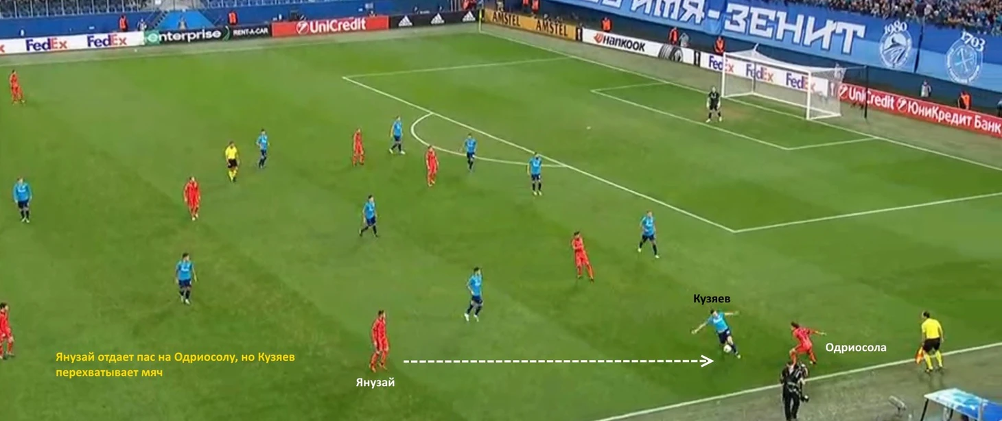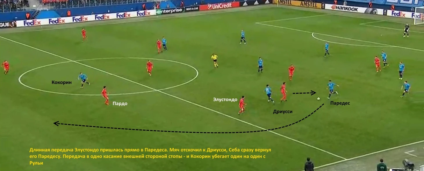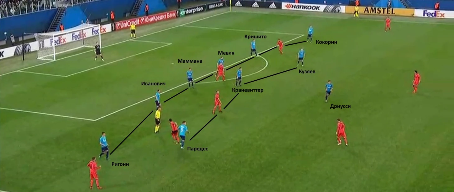 У «Зенита» все было по-другому. Ставка на открывания Дриусси и Кокорина в полуфланги для приема передач из глубины полностью сыграла – в похожем стиле «Зенит» громил «Спартак». Второй гол питерцев в целом – то, чего и хочет от своей команды Манчини.