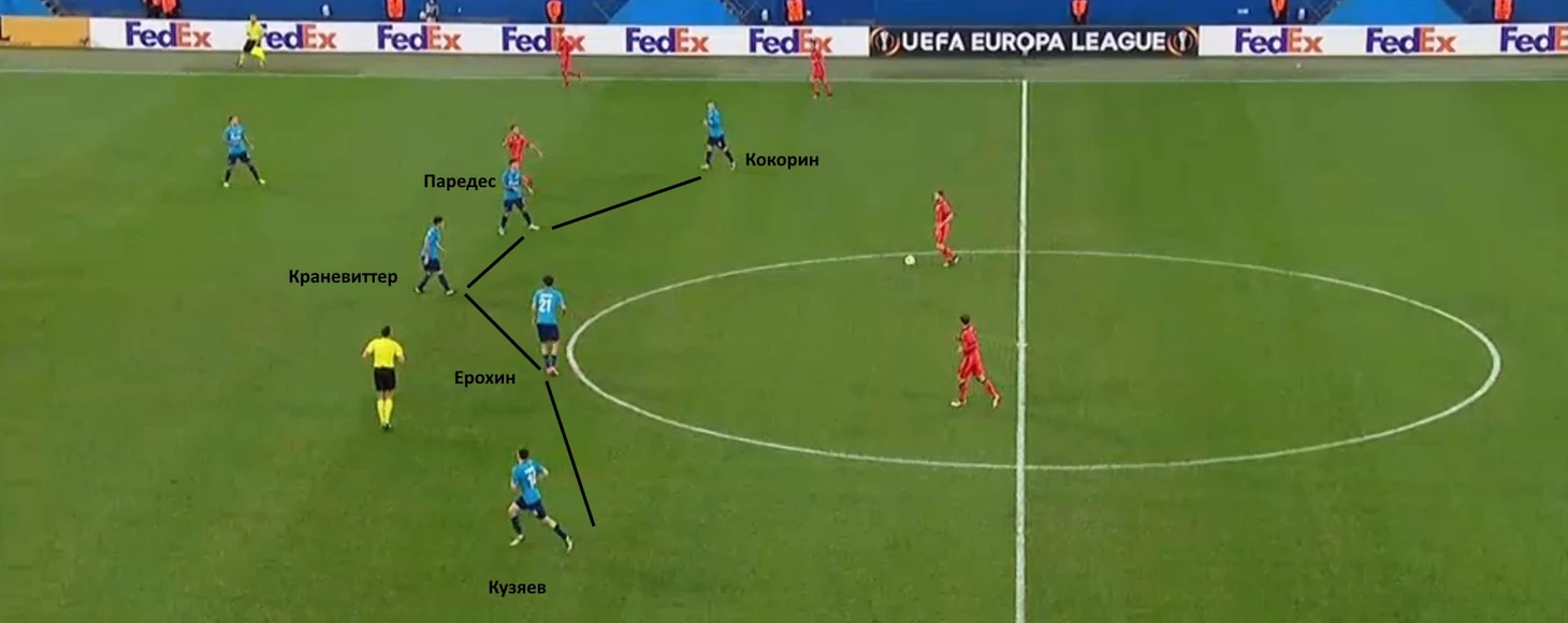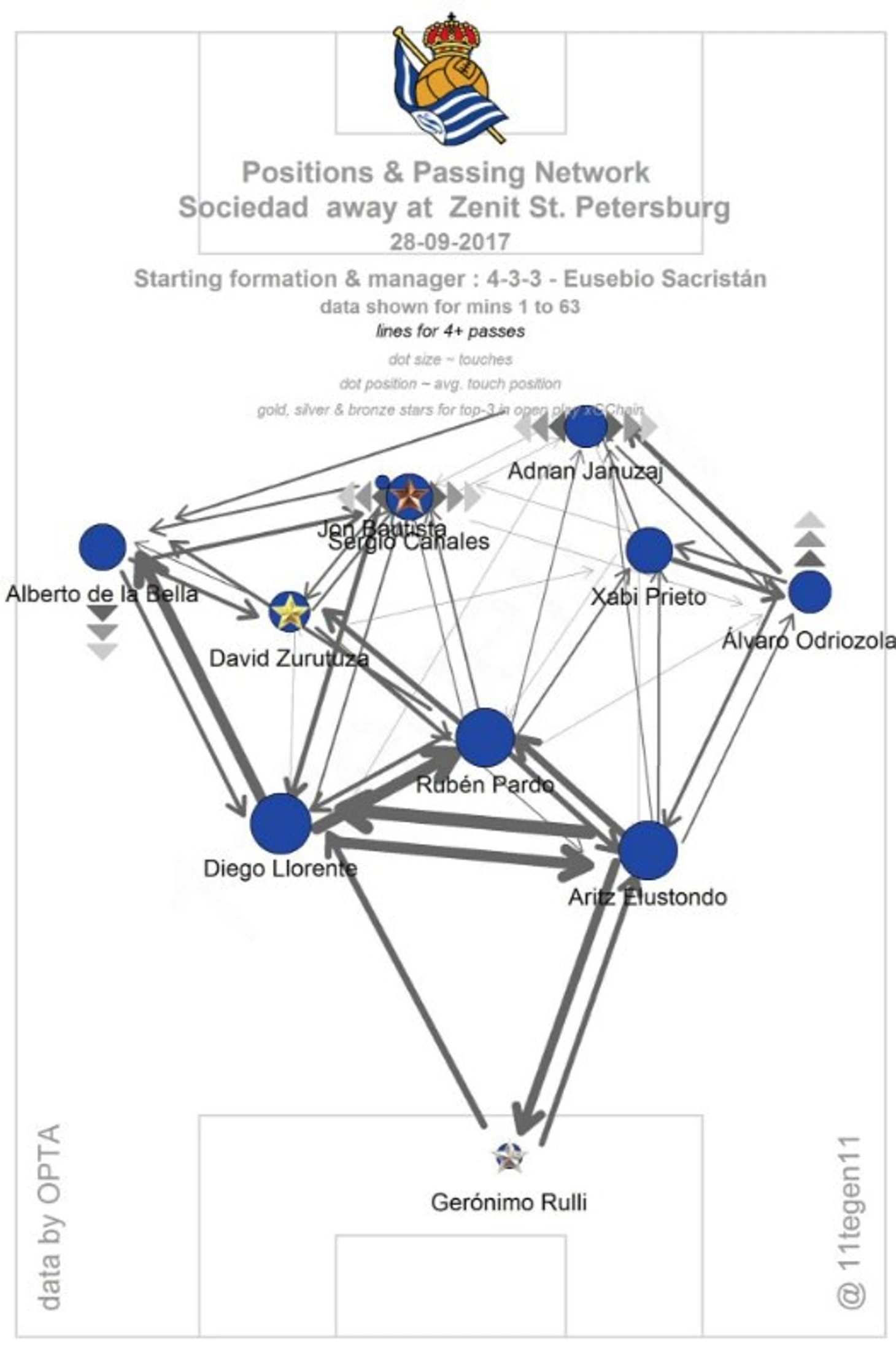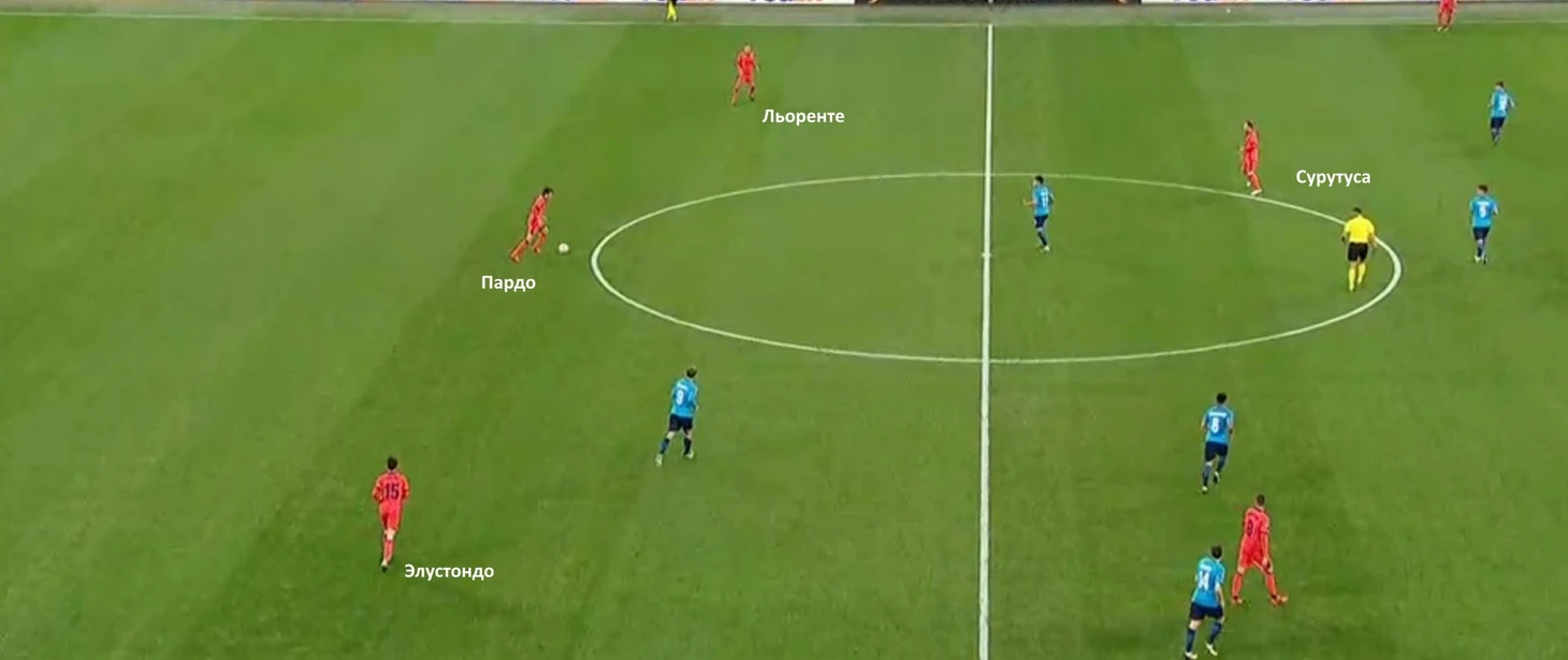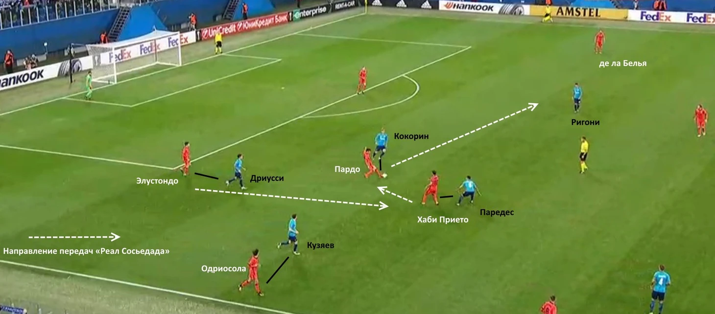 В первой фазе атаки «Реал Сосьедад» действовал по тем же принципам, что и «Зенит» в матчах премьер-лиги. Для розыгрыша мяча к центральным защитникам опускался опорник (Пардо).