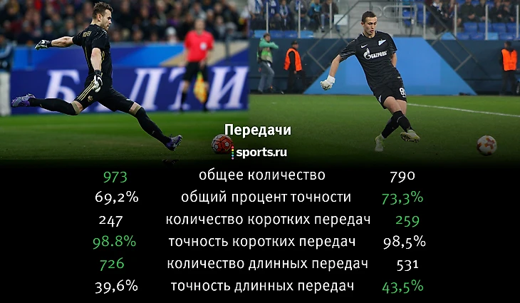 В текущем сезоне Андрей совершил 254 передачи, Акинфеев – 228. Голкипер «Зенита» гораздо чаще отдает пасы ближнему партнеру (115 коротких передач), а Акинфеев – выбивает мяч на чужую половину (чаще всего – на Вернблума).